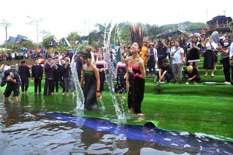 Các thí sinh của cuộc thi Hoa hậu Du lịch Thế giới năm 2022 trải nghiệm nghi lễ gội đầu của người Thái trắng. Ảnh: Quang Quyết