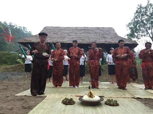 Khăn: Đàn ông Thổ đội khăn xếp, kiểu của người Việt (Kinh), may bằng vải lụa, màu nhiễu tím hoặc màu đen, dài khoảĩng 3m.