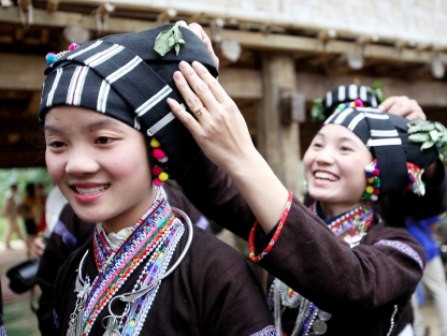 Khăn đội đầu được làm bằng vải bông, nhuộm chàm đen dài khoảng trên 4m, rộng 0,3m, hai đầu khăn có tua dài khoảng 0,2m. Trên nền đen của hai đầu khăn dệt xen kẽ 18 đường chỉ trắng to nhỏ khác nhau và hai đường chỉ vàng chạy ngang tô điểm cho khăn. Khi sử dụng, khăn được gấp bốn theo chiều dọc và được quấn quanh đầu nhiều vòng búi nghiêng về phía bên trái đầu.