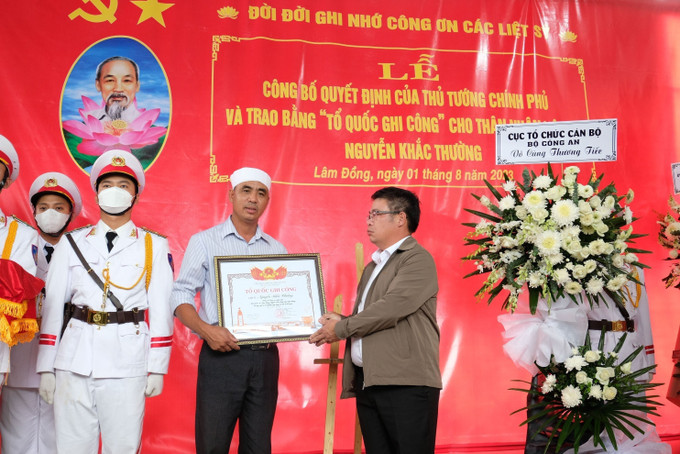 Lãnh đạo UBND tỉnh Lâm Đồng trao Bằng "Tổ quốc ghi công" của Thủ tướng Chính phủ đối với liệt sĩ Trung tá Nguyễn Khắc Thường, chiều 1/8/2023. Ảnh: TTXVN phát