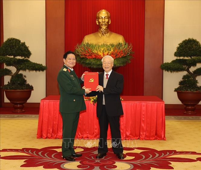 Tổng Bí thư Nguyễn Phú Trọng trao Quyết định và tặng hoa đồng chí Đại tướng Ngô Xuân Lịch, nguyên Ủy viên Bộ Chính trị, nguyên Phó Bí thư Quân ủy Trung ương, nguyên Bộ trưởng Bộ Quốc phòng. Ảnh: Trí Dũng – TTXVN