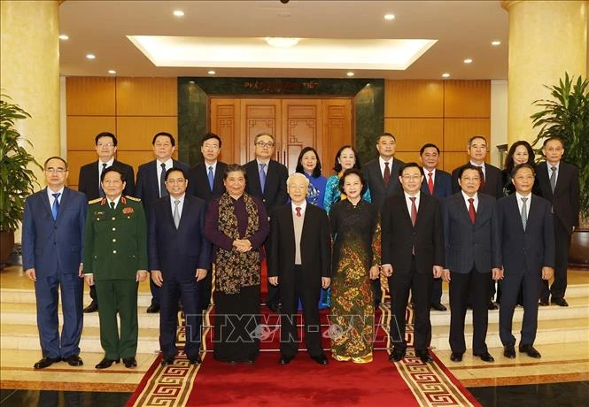 Tổng Bí thư Nguyễn Phú Trọng cùng các đồng chí lãnh đạo, nguyên lãnh đạo Đảng, Nhà nước chụp ảnh chung. Ảnh: Trí Dũng – TTXVN