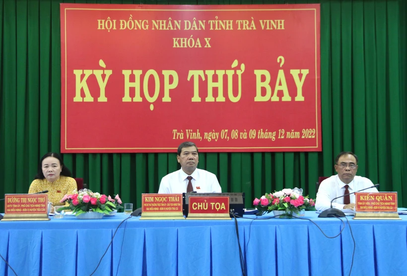 Từ ngày 7 - 9/12/2022, Hội đồng nhân dân tỉnh Trà Vinh khóa X, nhiệm kỳ 2021 - 2026 tổ chức kỳ họp thứ 7 để xem xét các báo cáo công tác năm 2022, đồng thời ban hành nhiều Nghị quyết quan trọng, trong đó có Nghị quyết Quy định hỗ trợ đóng bảo hiểm y tế cho người có uy tín trong đồng bào dân tộc thiểu số không thuộc đối tượng đã được ngân sách Nhà nước đóng và hỗ trợ mức đóng bảo hiểm y tế trên địa bàn tỉnh Trà Vinh giai đoạn 2023 - 2025. Ảnh: Thanh Hòa - TTXVN