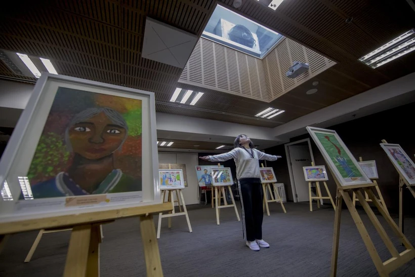 Bạn Chu Ánh Tuyết, 15 tuổi, một thí sinh cuộc thi vẽ tranh "Vì một Việt Nam tất thắng" tham dự triển lãm. Ảnh: unicef.org