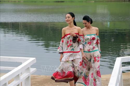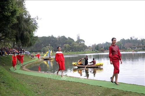| Người mẫu trình diễn thời trang Tơ lụa Bảo Lộc và Thổ cẩm Lâm Đồng. Ảnh: Chu Quốc Hùng-TTXVN |
