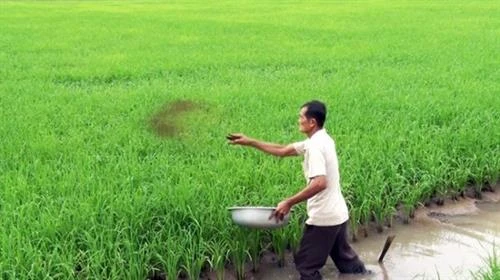| Nông dân Nguyễn Văn Thái bón phân hữu cơ cho lúa. Ảnh : travinh.tintuc.vn |