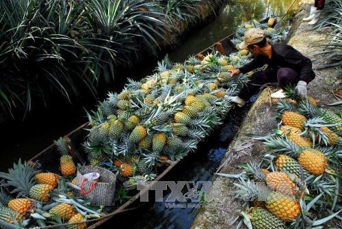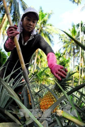 | Thu hoạch khóm (dứa) tại vườn của gia đình ông Vương Văn Lợi, ấp Vĩnh Phú, xã Vĩnh Hòa Phú trồng trên diện tích 9ha, bình quân mỗi năm thu hoạch hơn 50.000 trái. Ảnh: Mạnh Linh-TTXVN |