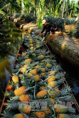 | Vườn khóm (dứa) của gia đình ông Huỳnh Cá Én (SN 1949, ấp Vĩnh Phú, xã Vĩnh Hòa Phú) trồng 1ha đang vào thời kỳ cho thu hoạch quả. Ảnh: Mạnh Linh-TTXVN |