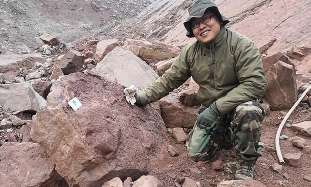 Nhà khảo cổ học Xing Lida bên cạnh dấu chân hóa thạch của khủng long. Ảnh: vietnamplus.vn