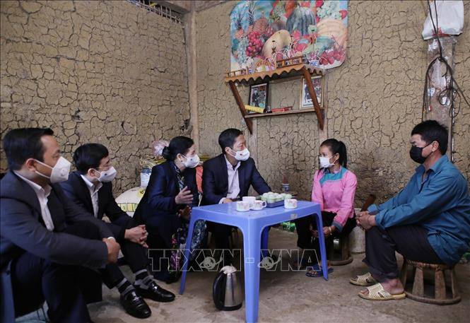 Ủy viên Bộ Chính trị, Trưởng Ban kinh tế Trung ương Trần Tuấn Anh thăm hỏi động viên, tặng quà cho gia đình hộ nghèo tại bản San Thàng, xã San, thàng thành phố Lai Châu. Ảnh: Quý Trung – TTXVN