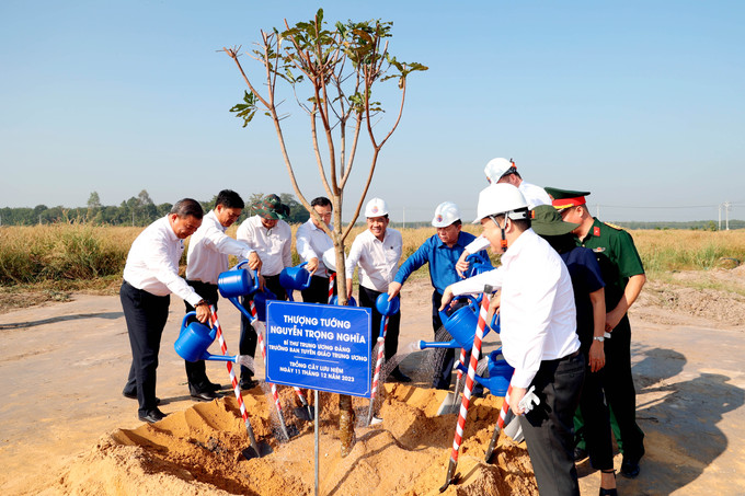 Bí thư Trung ương Đảng, Trưởng Ban Tuyên giáo Trung ương Nguyễn Trọng Nghĩa trồng cây lưu niệm tại dự án “Khu chăn nuôi ứng dụng công nghệ cao DHN Tây Ninh”. Ảnh: An Hiếu