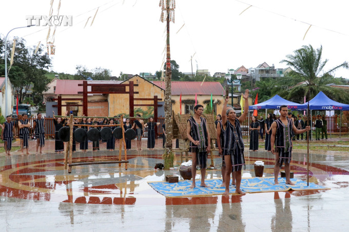 Sau lời khấn, từ hai phía, đội hình Chiêng và múa Xoang gồm hàng chục người gồm nam nữ, già trẻ trong trang phục dân tộc K’Ho vừa đi vừa múa theo hình vòng tròn xung quanh cây nêu.