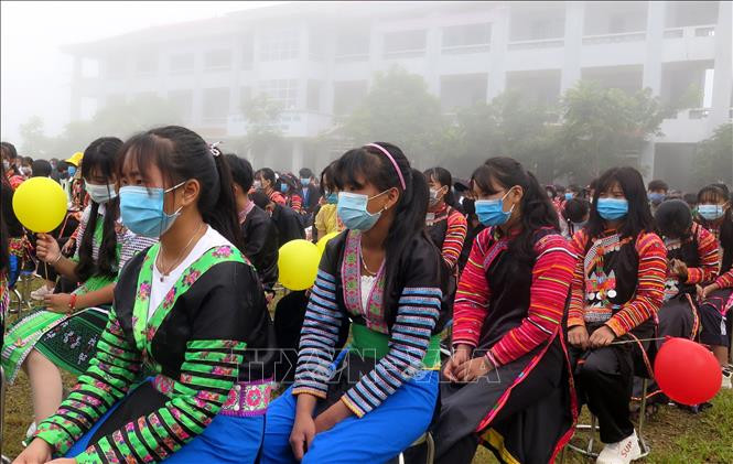 Trong trang phục truyền thống sặc sỡ của dân tộc mình, học sinh Trường Trung học phổ thông nội trú xã Ka Lăng đón năm học mới trong tiết trời sương mù dày đặc. Ảnh: Đinh Thùy – TTXVN