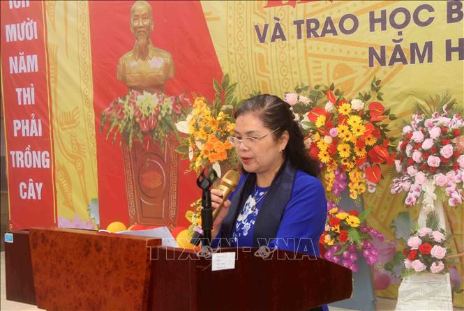 Bí thư Tỉnh ủy Lai Châu Giàng Páo Mỷ phát biểu biểu dương những kết quả cán bộ, giáo viên, học sinh Trường Trung học phổ thông nội trú xã Ka Lăng đạt được, tại lễ khai giảng năm học mới. Ảnh: Đinh Thùy – TTXVN