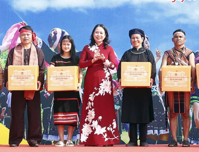 Quyền Chủ tịch nước Võ Thị Ánh Xuân tặng quà cho đại diện các dân tộc Việt Nam. Ảnh: Thống Nhất - TTXVN