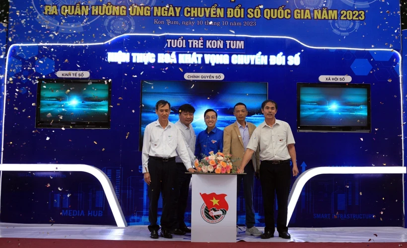 Các đại biểu ấn nút phát động ra quân hưởng ứng Ngày Chuyển đổi số quốc gia năm 2023 với chủ đề “Tuổi trẻ Kon Tum hiện thực hóa khát vọng Chuyển đổi số”. Ảnh: Khoa Chương - TTXVN