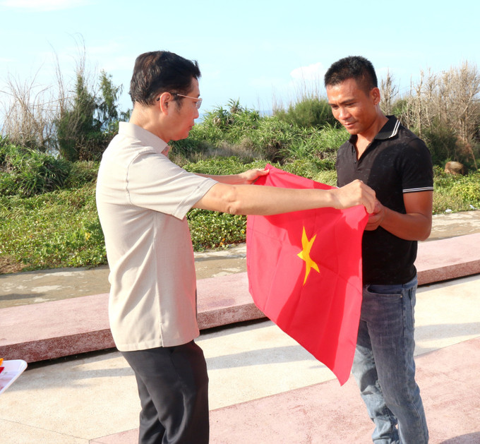 Đại diện lãnh đạo Công ty TNHH Một thành viên ITAXA tặng cờ cho bà con ngư dân tại huyện đảo Phú Quý. Ảnh: Nguyễn Thanh – TTXVN