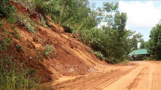 Đất từ đồi cao sạt xuống mặt đường ĐT 755B tại khu vực qua địa bàn xã Thống Nhất, huyện Bù Đăng, Bình Phước. Ảnh: Sỹ Tuyên - TTXVN