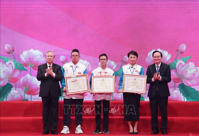 Học sinh, sinh viên xuất sắc tiêu biểu học tập và làm theo tư tưởng, đạo đức, phong cách Hồ Chí Minh năm 2020 được tuyên dương. Ảnh: Thanh Tùng - TTXVN