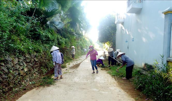 Hội viên Chi hội phụ nữ thôn 7, xã Lưỡng Vượng, vệ sinh đường làng ngõ xóm. Ảnh: Nam Sương - TTXVN
