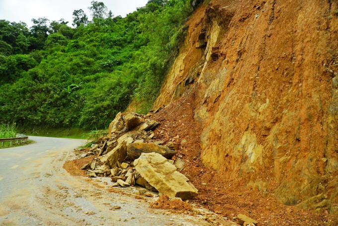 Sạt lở do ảnh hưởng của mưa lũ trên tuyến quốc lộ 4H từ huyện Mường Chà đi Mường Nhé (tỉnh Điện Biên). Ảnh: Xuân Tư - TTXVN