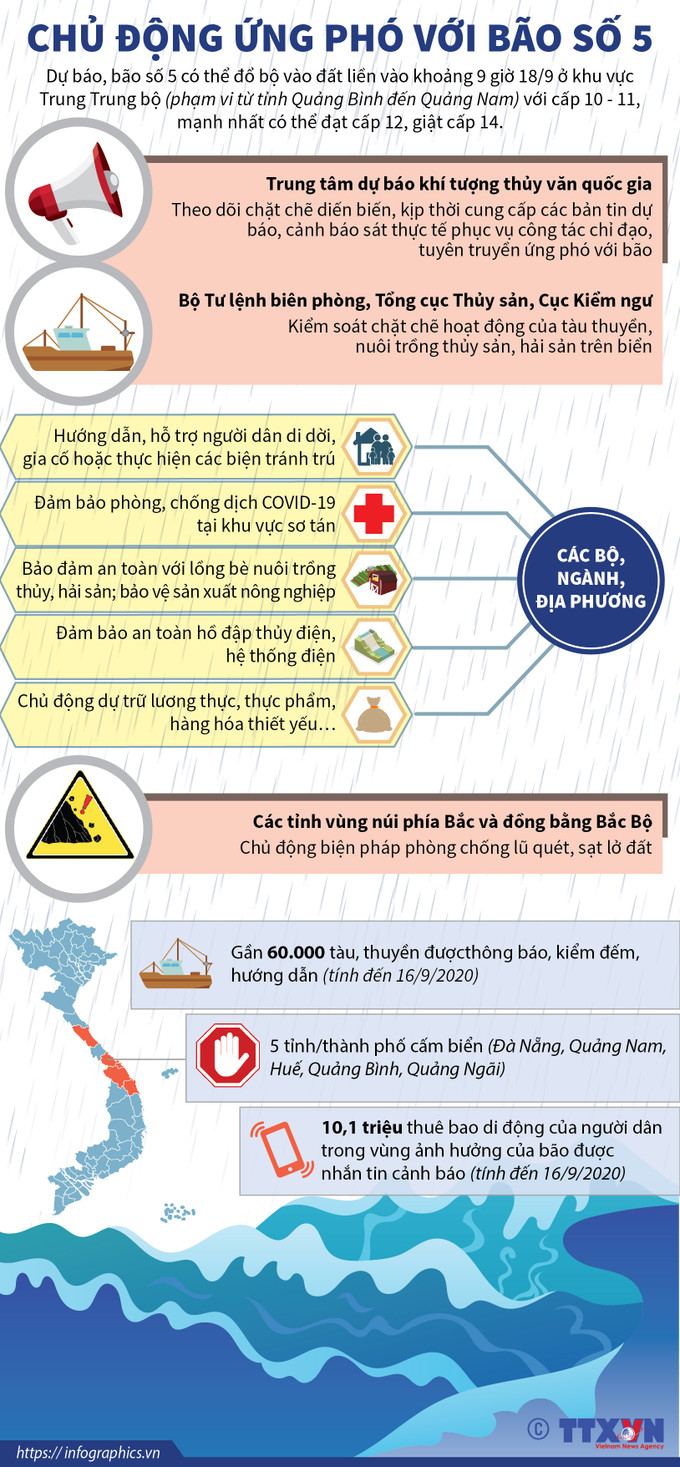 Theo dự báo của Trung tâm Khí tượng Thủy văn Trung ương, bão số 5 là cơn bão mạnh cấp 10-11, gây ảnh hưởng trực tiếp từ vùng biển Quảng Bình đến Quảng Ngãi. Dự kiến, bão số 5 có thể đổ bộ vào đất liền sáng 18/9 với sức gió vùng gần tâm bão mạnh cấp 11-12.