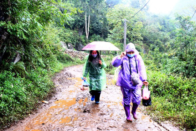 Các cô giáo điểm trường Lũng Rượi trên đường đón các em học sinh đến lớp. Ảnh: baocaobang.vn