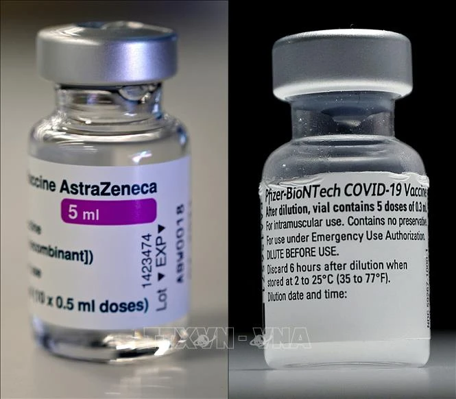 Vaccine ngừa COVID-19 của AstraZeneca (trái) và Pfizer - BioNTech (phải). Ảnh: AFP/TTXVN