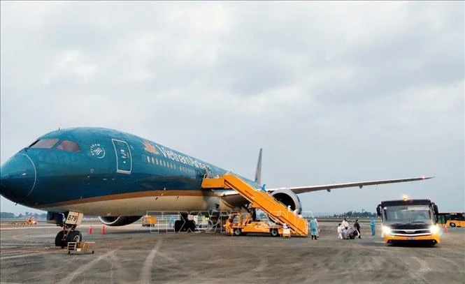 Máy bay Airbus 350 mang số hiệu VN62 của Hãng hàng không Vietnam Airlines đưa 345 người Việt từ Liên bang Nga về Việt Nam. Ảnh: TTXVN phát