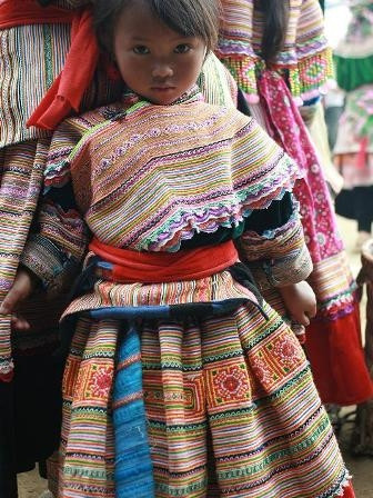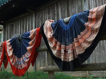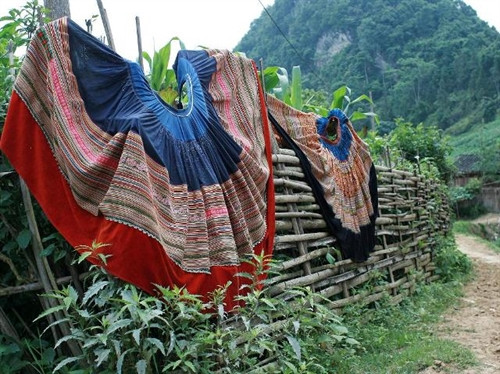 Phụ nữ H’Mông vùng Đông Bắc thường phơi bộ váy áo của mình trên đá. Trên nền xám lạnh và khô của đá là một mặt trời xòe rộng, rực rỡ sắc màu. Phụ nữ H’Mông vùng Tây Bắc thường phơi váy trên những chiếc sào, bộ váy xếp đôi xòe rộng như một chiếc quạt khổng lồ. Đất trời miền núi với thiên nhiên hoang sơ và sự cần cù nhẫn nại, khéo léo của người phụ nữ H’Mông đã kết tinh tài hoa trong chiếc váy.