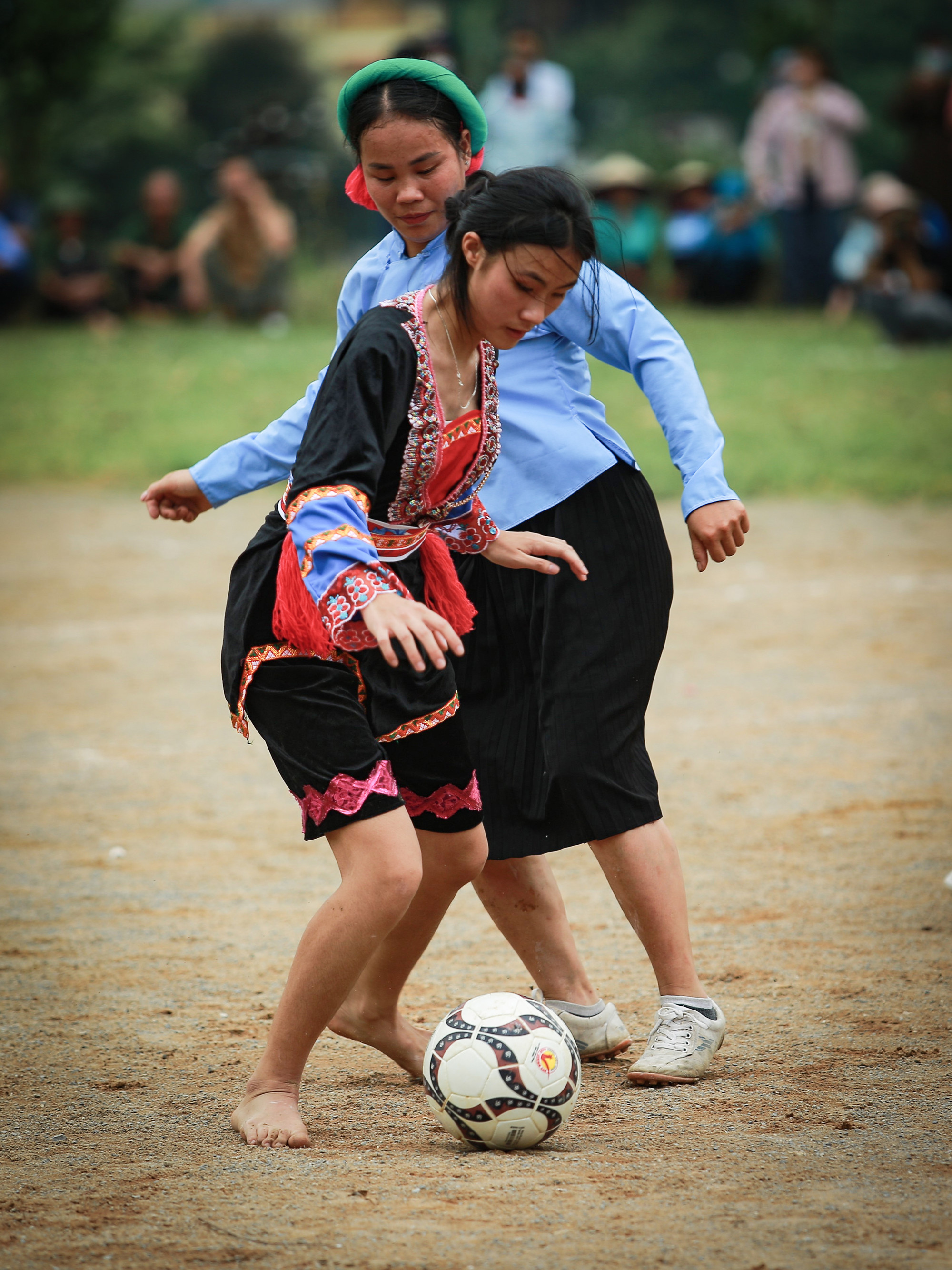 Đặc biệt, khi ra sân đá bóng, chị em phụ nữ Sán Chỉ nơi đây đều mặc bộ trang phục truyền thống của dân tộc mình thể hiện sự năng động nhưng không kém phần duyên dáng.