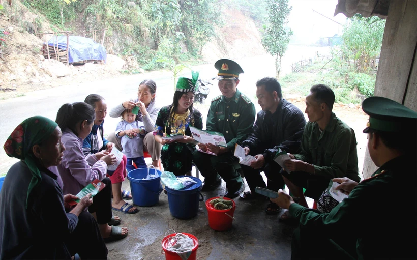 Các chiến sĩ Bộ đội biên phòng tỉnh Nghệ An tuyên truyền pháp luật cho bà con vùng sau vùng xa huyện biên giới Kỳ Sơn. Ảnh: Văn Tý-TTXVN
