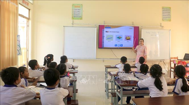 Giờ học Tiếng Anh của học sinh trường Tiểu học Thạch Thia, xã Loan Mỹ (Tam Bình, Vĩnh Long). Ảnh: Lê Thúy Hằng – TXTVN