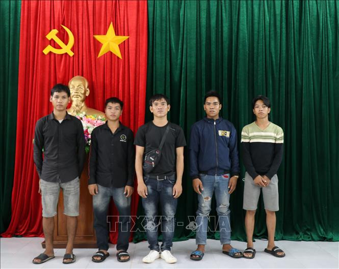 5 thanh niên vừa được lực lượng biên phòng tỉnh Gia Lai hỗ trợ đưa về địa phương an toàn từ việc tiếp nhận từ cảnh sát biên phòng Campuchia tại cửa khẩu Mộc Bài - Tây Ninh. Ảnh: Hồng Điệp – TTXVN