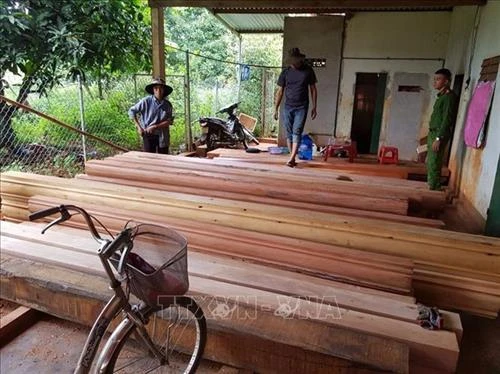 | Điểm tập kết gỗ lậu được cơ quan chức năng phát hiện. Ảnh: TTXVN phát |
