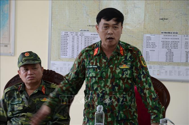 Thượng tá Lê Trung Thành, Chỉ huy trưởng Bộ Chỉ huy quân sự tỉnh Quảng Nam phát biểu, kết luận cuộc họp của Ban Chỉ huy tiền phương. Ảnh: Quốc Dũng - TTXVN