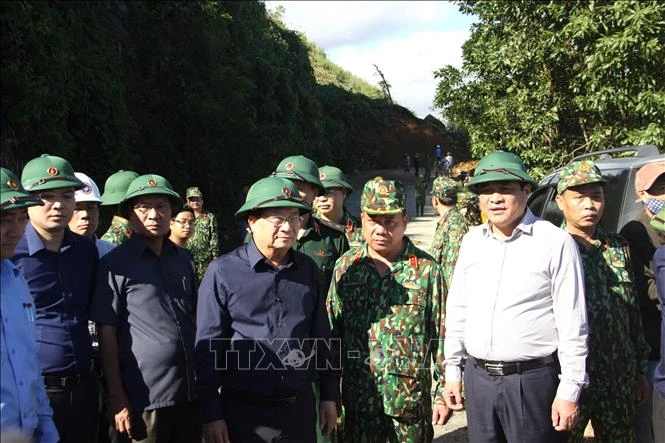 Phó Thủ tướng Trịnh Đình Dũng kiểm tra và chỉ đạo công tác cứu hộ, cứu nạn trên đường đến hiện trường vụ tai nạn. Ảnh: Trịnh Bang Nhiệm - TTXVN