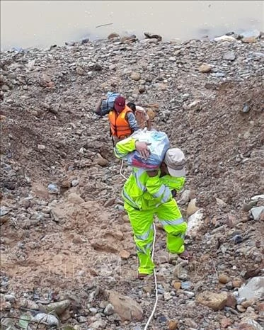 Vận chuyển lương thực, thực phẩm, thuốc men vào khu vực Nhà máy thủy điện Rào Trăng 3, Rào Trăng 4. Ảnh: TTXVN