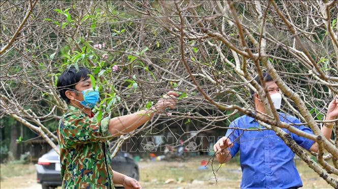 Công đoạn tuốt lá để đào ra hoa vào dịp Tết. Ảnh: Hoa Mai - TTXVN