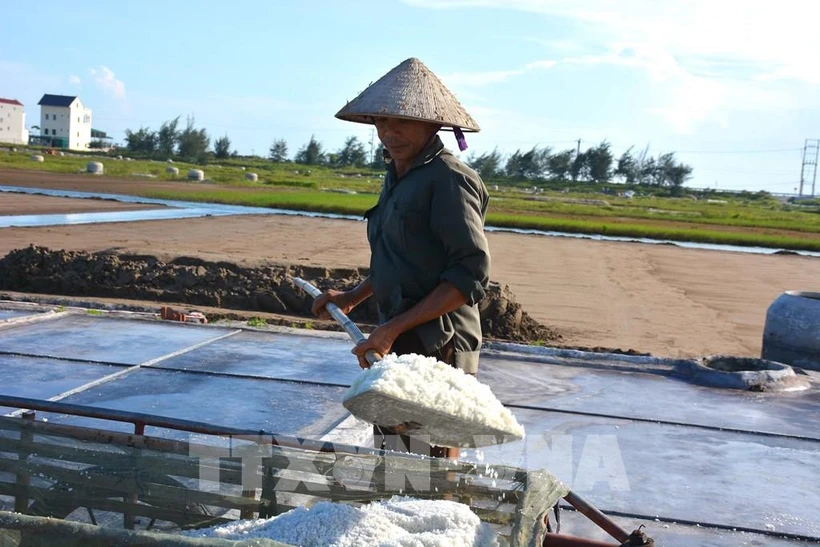 Thu hoạch muối trên cánh đồng muối. Ảnh: Công Luật - TTXVN