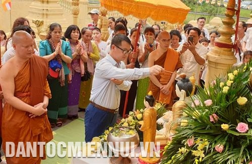 | Các nhà sư cùng phật tử làm Lễ cúng để tắm Phật. Ảnh: Hoàng Tâm |