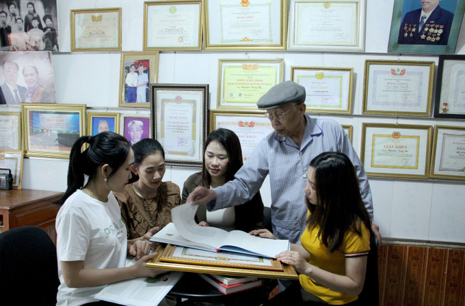Nghệ nhân Nguyễn Trọng Hà giới thiệu đầu sách mới trong thư viện gia đình. Ảnh: Văn Tý-TTXVN