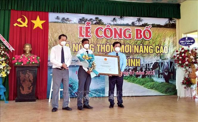 Lãnh đạo UBND tỉnh Sóc Trăng trao Bằng Công nhận xã Viên Bình đạt chuẩn NTM nâng cao. Ảnh: Trung Hiếu-TTXVN