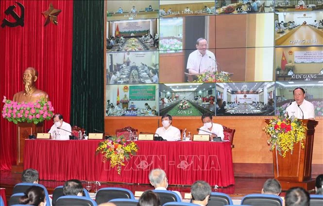 Hội nghị được tổ chức theo hình thức trực tuyến, kết nối với các tỉnh thành và một số Bộ, ngành. Ảnh: Thanh Tùng - TTXVN