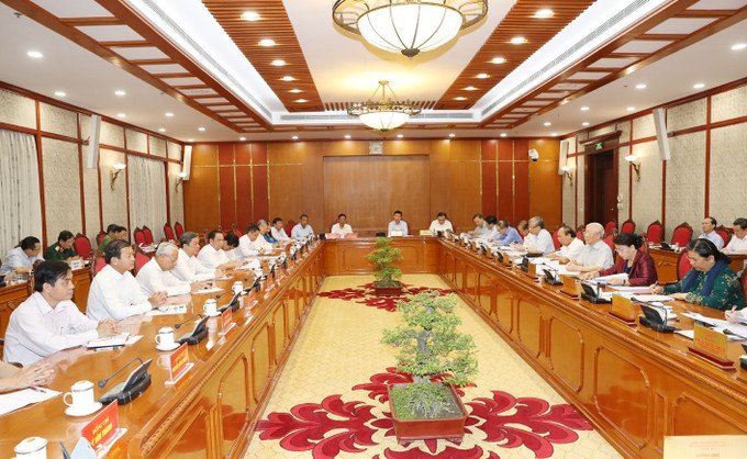 Tổng Bí thư, Chủ tịch nước Nguyễn Phú Trọng chủ trì cuộc họp của Bộ Chính trị với Ban Thường vụ Thành ủy Cần Thơ. Ảnh: Trí Dũng - TTXVN