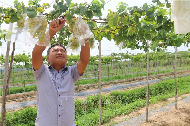 Tham gia mô hình, ông Thanh được hỗ trợ 600 cây giống, thiết bị làm giàn nho, hệ thống tưới tiết kiệm nước và hướng dẫn quy trình sản xuất… Kết quả, tháng 4/2022, vườn nho cho thu hoạch vụ đầu tiên, năng suất đạt 1,2 tấn/1.000m2. Với giá bán 100.000 đồng/kg tại vườn, sau khi trừ chi phí, gia đình ông Thanh lãi trên 100 triệu đồng. Ngoài ra, gia đình ông Thanh còn có nguồn thu nhập từ việc nhân cây nho giống để bán với giá từ 120.000 – 150.000 đồng/cây.