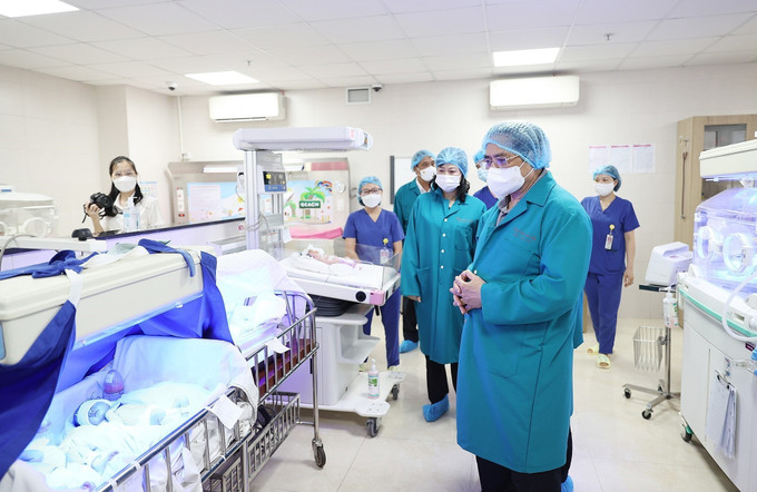 Thủ tướng Chính phủ Phạm Minh Chính thăm bệnh nhi đang được chăm sóc tại Bệnh viện sản nhi tỉnh Phú Thọ.Ảnh: Dương Giang - TTXVN