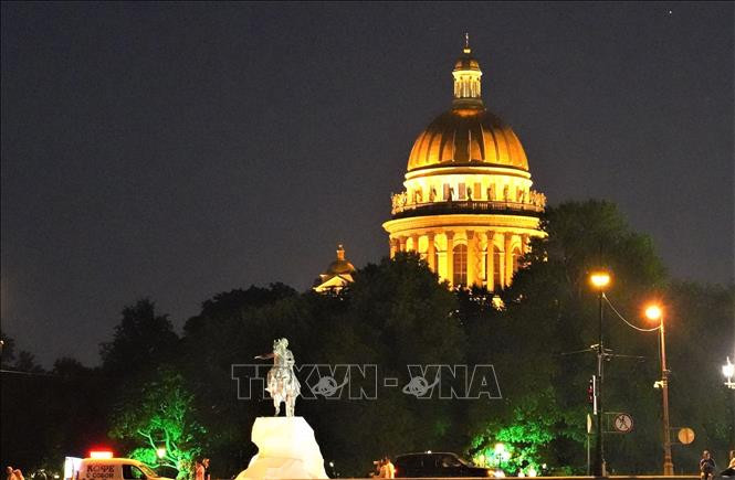 Tượng Piotr Đại đế và Nhà thờ thánh Issac, những biểu tượng của St. Petersburg về đêm. Ảnh: Duy Trinh - PV TTXVN tại Nga