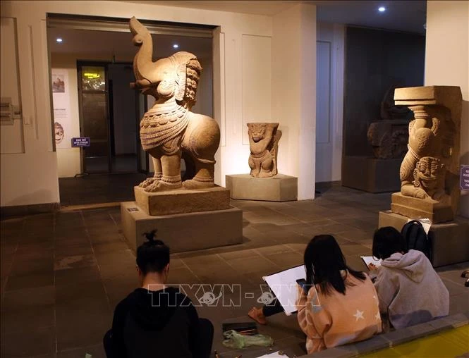 Sinh viên tham quan tìm hiểu về các Bảo vật Quốc gia đang được trưng bày tại Bảo tàng Điêu khắc Chăm (Đà Nẵng). Ảnh: Trần Lê Lâm - TTXVN