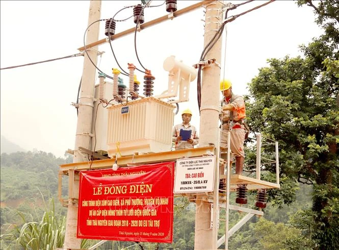 Cán bộ kỹ thuật của điện lực Thái Nguyên đóng điện cho công trình điện xóm Cao Biền. Ảnh: Hoàng Nguyên - TTXVN